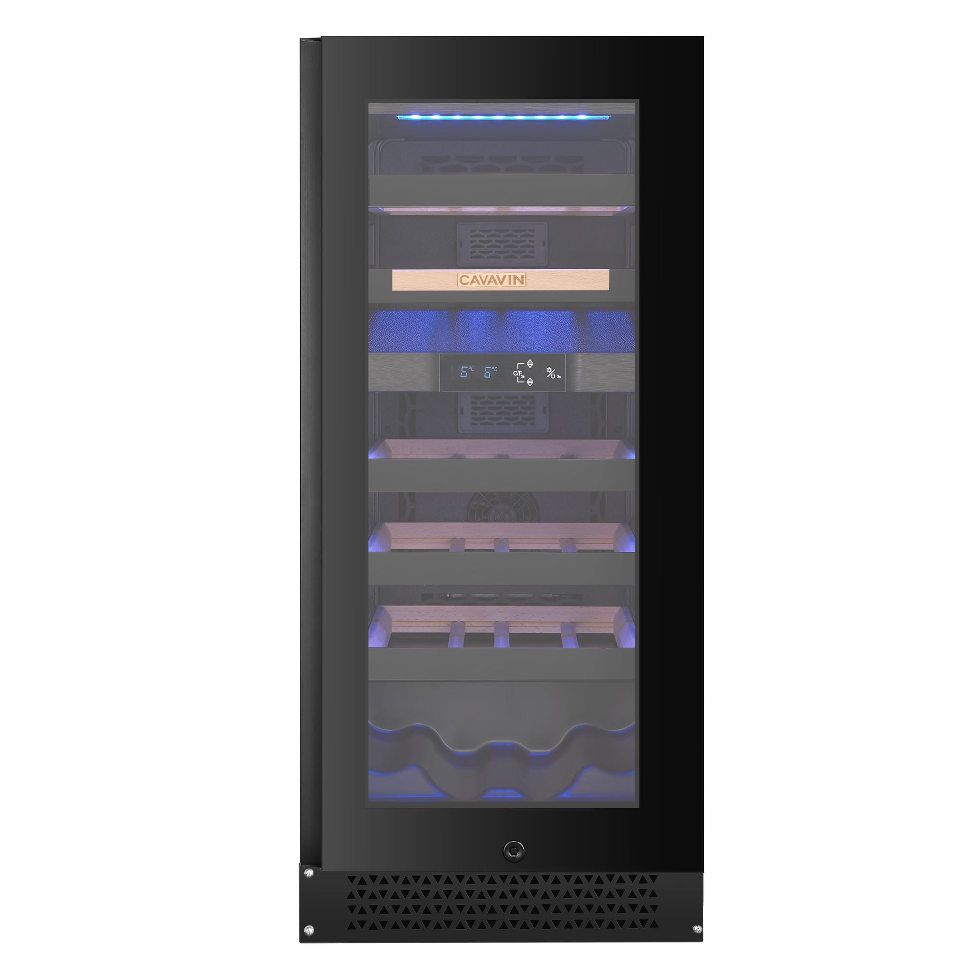 24-bottle capacity, with black cabinet (built-in or freestanding installation). Features dual temperature zones, a touch-control LCD panel, UV-resistant glass door with stainless steel frame, integrated lock, contemporary handle, and sliding shelves. Interior LED lighting with a choice of three colors (warm white, cool white, or blue), which can remain on continuously or activate only when the door is opened.