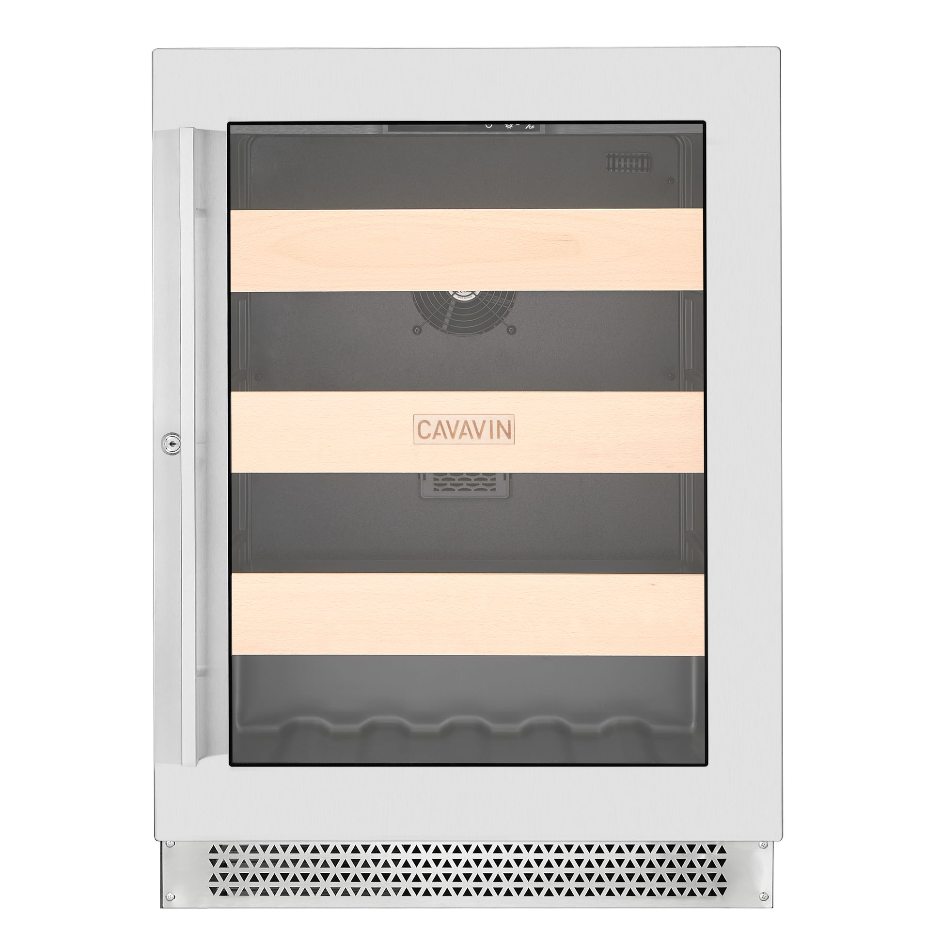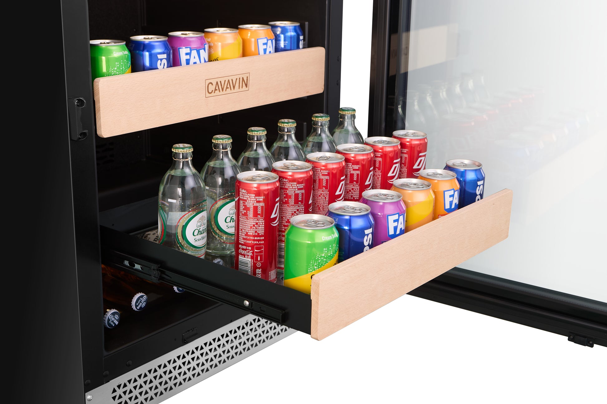 VINOA Collection Capacity of 148 cans, with black casing (built-in or freestanding installation). Equipped with one temperature zone, a touch controller with LCD screen, a UV anti-glass door with a stainless steel frame, an integrated lock, and sliding glass shelves for beverages. Interior LED lighting with a choice of three colors (warm white, cool white, or blue), which can be kept on at all times or only when the door is opened.